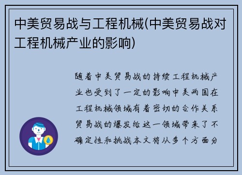 随着中美贸易战的持续,工程机械产业也受到了一定的影响。中美两国在工程机械领域有着密切的合作关系,贸易战的爆发给这一领域带来了不确定性和挑战。本文将从多个方面分析中美贸易战对工程机械产业的影响。